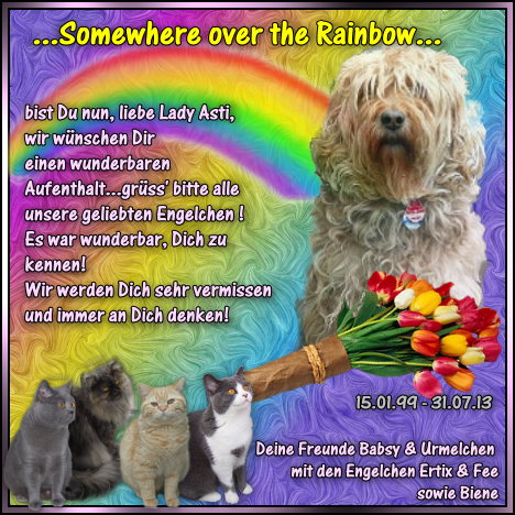 Heute haben wir erst erfahren, dass leider auch unsere langjährige Freundin Lady Asti am 31.07.13 über die Regenbogenbrücke gehen musste...wir sind total traurig und sind in Gedanken bei Ihrer Familie und Sir Willi !!!